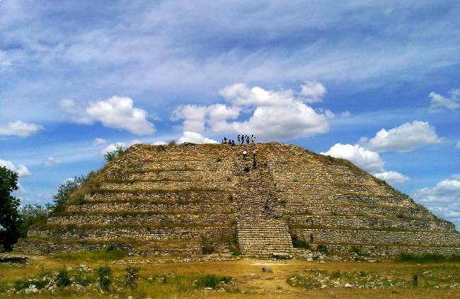 Pero había tiempo para disfrutar los columpios y los árboles frondosos que estaban en el jardín antes de salir, caminamos en el pasto y nos columpiamos, luego tomamos camino a la pirámide, usamos el coche sin saber que estaba a tan solo unas cuadras. En la búsqueda del lugar, erramos en una calle al tomarla en contra de su sentido habitual, entendimos perfectamente que esa sociedad funciona en orden porque todos en su medida contribuyen a que así sea. Nos equivocamos y una moto nos señaló que habíamos doblado en sentido contrario, un auto que pasaba también nos alertó con el claxon, gente que iba pasando también, los taxistas por igual, todo el que vio, nos lo señaló; por supuesto corregimos de inmediato, por fortuna, aunque fue estresante el momento, la enmienda también fue bastante rápida. Estacionamos frente al portón de acceso a la pirámide. Entramos y comenzamos a ascender, primero el área que rodea la pirámide con cierto grado de inclinación, luego la pirámide en sí. Como la mayoría de estas, sus escalones altísimos ahora sí lograrían el registro de los pasos dados en el marcador; a mitad del camino se comenzaba a sentir el esfuerzo cardiaco; quizás de todo el viaje esto haya sido lo que mayor fuerza física implicó. La experiencia, excepcional: llegar arriba, desde allí divisar el pueblo entero, respirar aire fresco a pesar de estar en un lugar caluroso, tomar algunas fotos panorámicas, descansar. Era temprano, quizá fuimos de las primeras visitas al lugar, bajamos y al cruzar la calle un pequeño negocio de “recuerdos” nos ofreció agua, eso fue lo que compramos.
